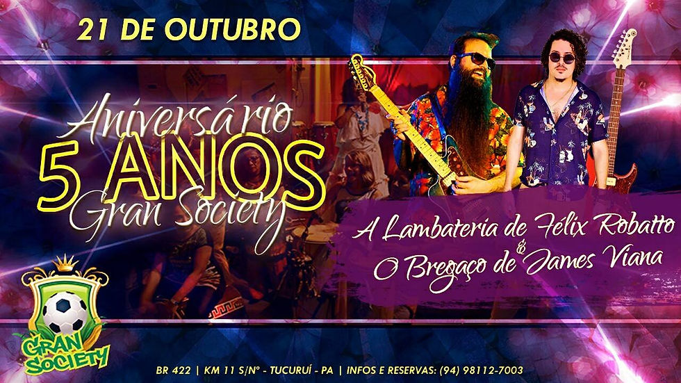 Neste sábado, dia 21 de outubro, o espaço Gran Society comemora cinco anos e a festa será animada pelo brega de James Viana e o repertório latino-amazônico de Félix Robatto.