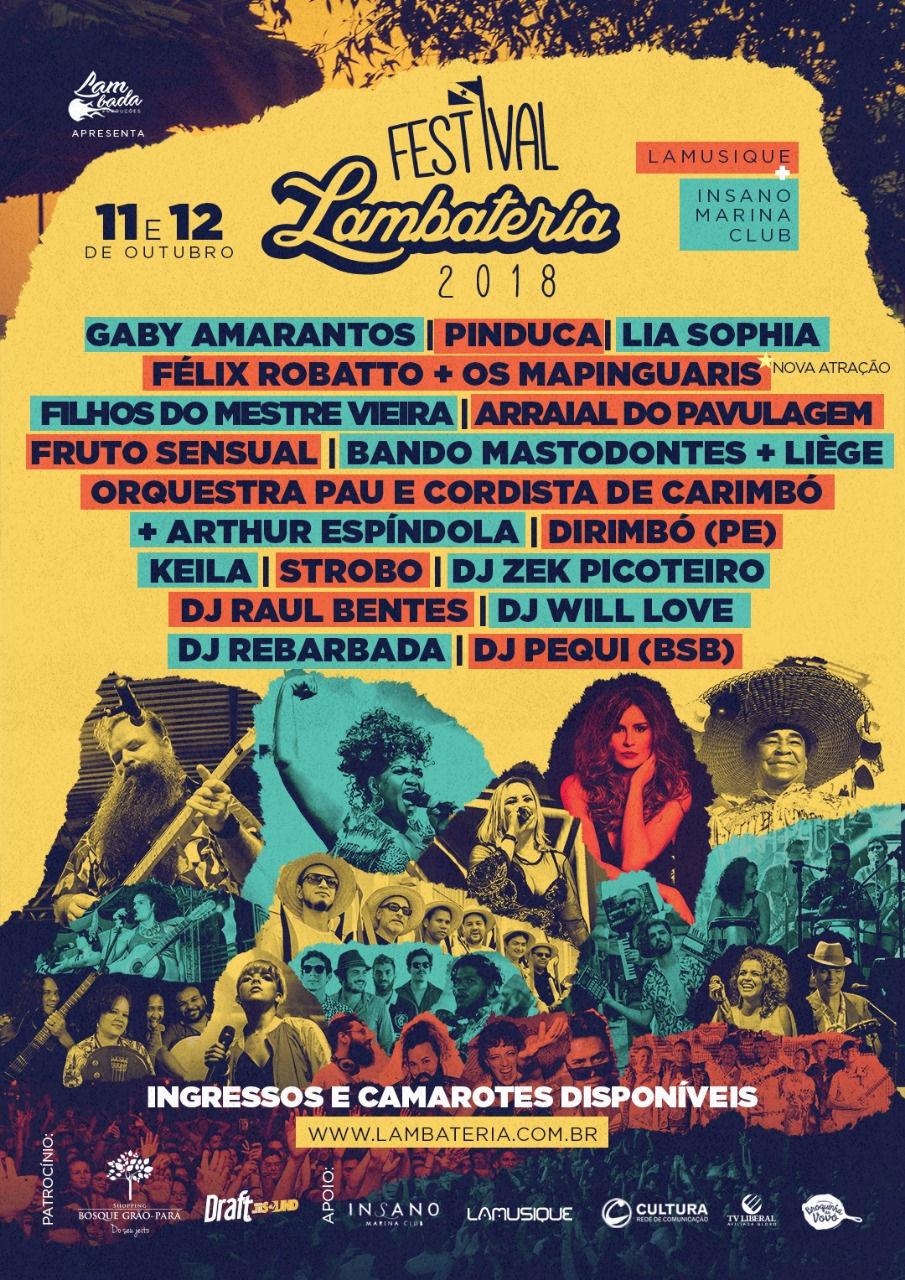 Serviço: O Festival Lambateria no Círio Ano 2 com Pinduca, Lia Sophia, Gaby Amarantos, Arraial do Pavulagem, Fruto Sensual, Félix Robatto, Sammliz, Strobo, Keila, Arthur Espíndola, Orquestra Pau e Cordista de Carimbó, Mastodontes, Liège, banda do Filhos do Mestre Vieira, Dirimbó (PE), DJs Zek Picoteiro, Raul Bentes, Will Love, Rebarbada e Pequí (GO) será nos dias 11 e 12 de outubro de 2018 (dia 11 no La Musique e dia 12 no Insano Marina Club - Rua São Boaventura, 268 - Cidade Velha. Ingressos para o dia 11/10: Lote promocional: R$ 15, 1º Lote: R$ 20 e ingresso inteiro: R$ 25. Ingressos para o dia 12/10: Lote promocional a R$ 30,00, 1º lote: R$ 40, 2º lote: R$ 50 e ingresso inteiro a R$ 60. Vendas antecipadas no Sympla Vendas de camarotes e ingressos físicos em breve. Informações: (91) 98026-1595 / www.lambateria.com.br. Apoio cultural: Insano Marina Club e La Musique.